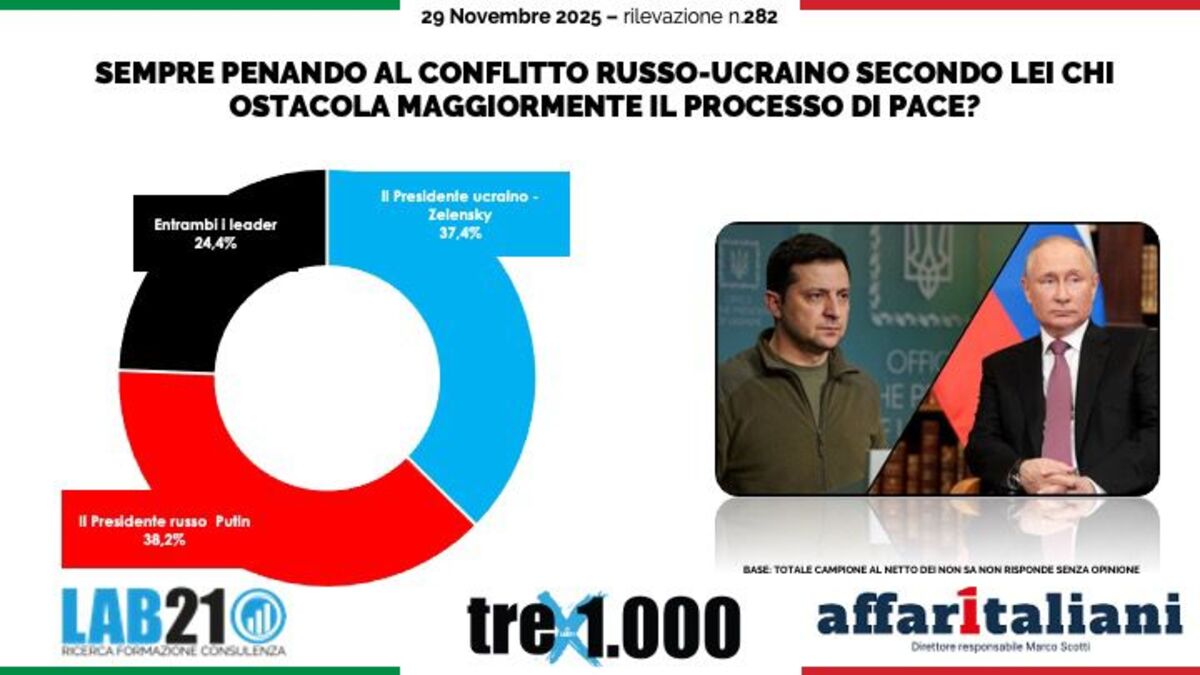 Non solo. Alla domanda su chi ostacoli maggiormente il processo di pace il 38,2% risponde il presidente russo Vladimir Putin ma ben il 37,4% ritiene che la colpa sia del leader ucraino Zelensky. Per il 24,4% la responsabilità è di entrambi i presidenti. Quindi una percentuale quasi identica e a favore di Zelensky nemmeno un italiano su quattro. Una linea chiara quell'opinione pubblica italiana che contrasta con quella del governo Meloni, che comunque in Europa cerca di mantenere stretto il legame con gli Usa di Donald Trump, e soprattutto una linea che smentisce il mainstream europeo di Macron, von der Leyen e Starmer.