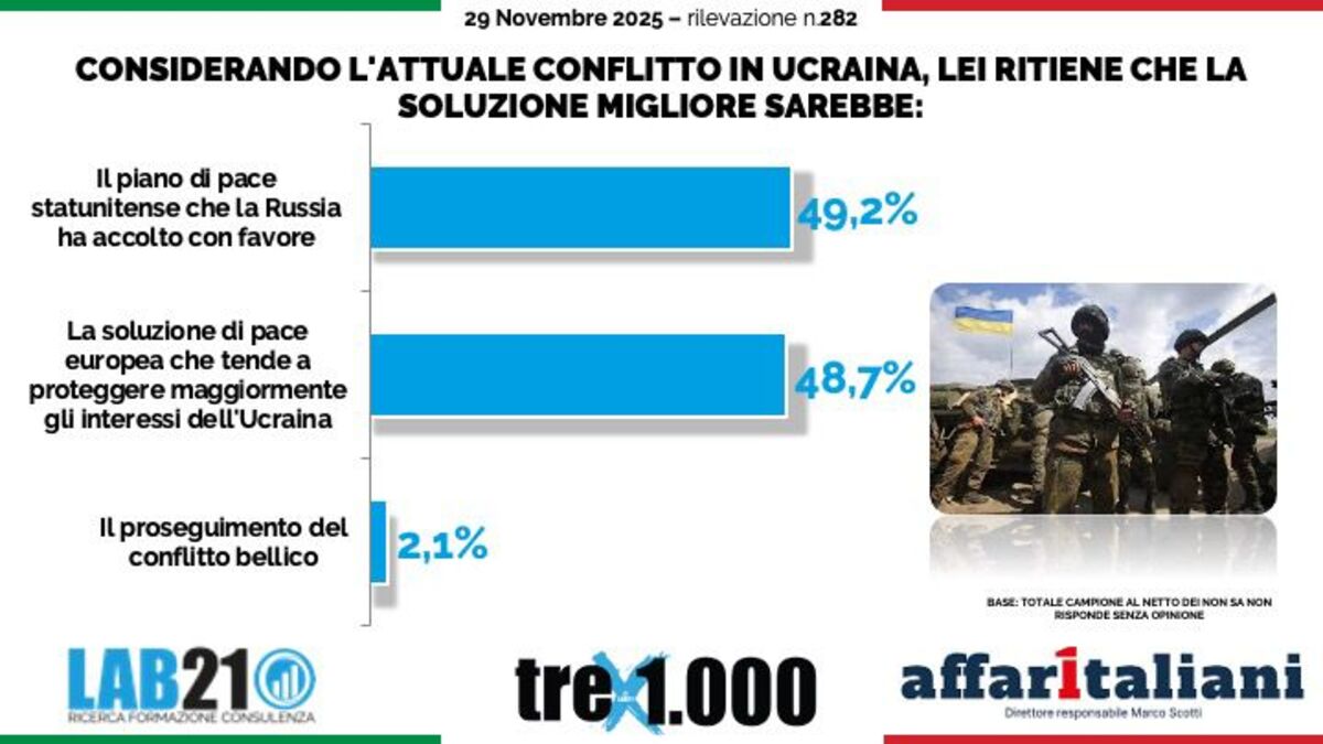 La maggioranza degli italiani non è al fianco dell'Ucraina e del suo presidente Volodymyr Zelensky. Il sondaggio realizzato per Affaritaliani da Roberto Baldassari, direttore generale dell'istituto demoscopico Lab21, non lascia dubbi. Il 49,2% degli intervistati considera la soluzione migliore per il conflitto il piano originario statunitense gradito alla Russia. Solo il 48,7% del campione opta per la soluzione europea più favorevole a Kiev.
