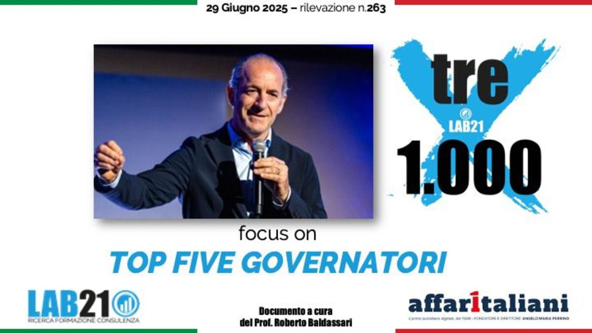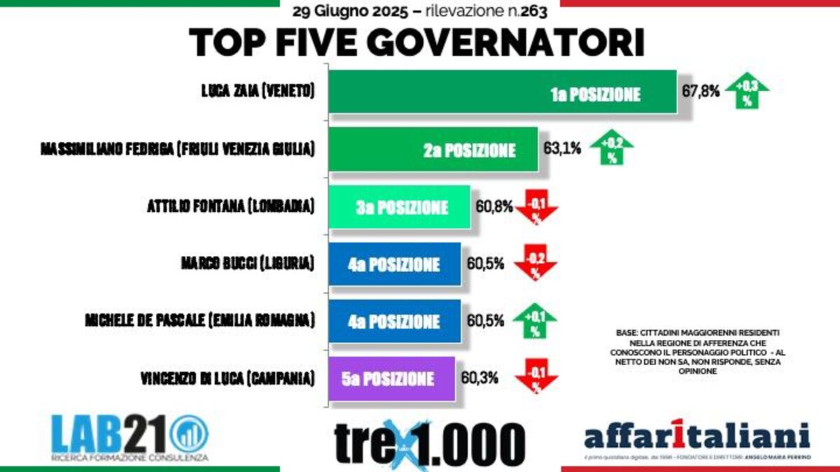 Trionfo incontrastato per Luca Zaia, Governatore del Veneto, nella ‘top five’ dei presidente di regione più amati. Zaia si conferma ampiamente in prima posizione con una percentuale di gradimento ancora in crescita al 67,8%. Tripletta leghista con al secondo posto Massimiliano Fedriga, Friuli Venezia Giulia, e in terza posizione Attilio Fontana, Lombardia. Marco Bucci, Liguria, e Michele De Pascale, Emilia Romagna, quarti e in quinta posizione Vincenzo De Luca, presidente della Campania.