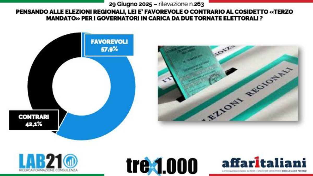 La maggioranza ampia e netta degli italiani, pari al 57,9%, è favorevole al terzo mandato per i presidenti di regione, come chiesto a gran voce in particolare dalla Lega. Contrario solo il 42,1% degli intervistati. E’ il principale risultato del sondaggio realizzato per Affaritaliani.it da Roberto Baldassari, direttore generale dell’istituto demoscopico Lab21.