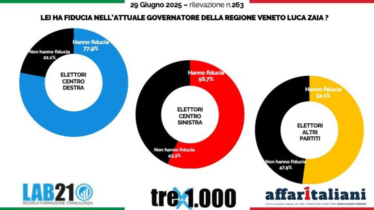 “È un risultato certamente lusinghiero e lo accolgo con grande gratitudine. Tuttavia, lo considero soprattutto la conferma che un modello amministrativo fondato su concretezza, ascolto e visione continua a trovare riscontro tra i cittadini. Questo risultato non premia solo me, ma una squadra che ogni giorno si impegna per migliorare la vita del nostro territorio. Luca Zaia, Governatore del Veneto intervistato da Affaritaliani.it, legge così il sondaggio (per Affaritaliani.it) dell’istituto demoscopico Lab21 del 29 giugno 2025 che lo vede saldamente in testa alla classifica dei presidenti di Regione, con un gradimento ancora in crescita, che sfiora il 70%. Sfiora l’80% di fiducia negli elettori di Centrodestra, ma quel che fa notizia è che anche quasi il 60% degli elettori di Centrosinistra danno fiducia al presidente della regione Veneto.