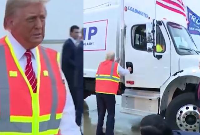 Usa 2024, nuovo show di Trump: sale su un camion della spazzatura con un giubbotto da netturbino e elogia i suoi elettori