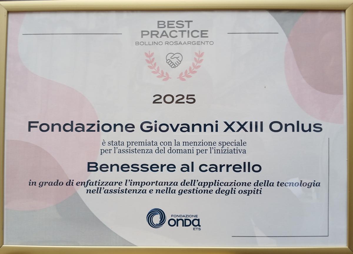 La Fondazione “Giovanni XXIII” Onlus di Bitonto è stata premiata con una menzione speciale, tra le uniche 4 Italia, alla seconda edizione del Concorso “Best Practice” promosso da Fondazione Onda ETS, che mira a identificare e valorizzare le Residenze Sanitarie Assistenziali (RSA) e le Case di riposo del circuito Bollino RosaArgento 2025-2026.