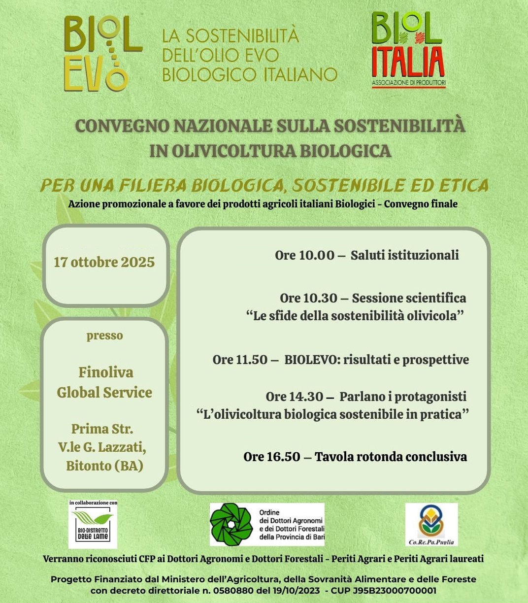 Sarà questo il tema principale del Convegno Nazionale sulla Sostenibilità in Olivicoltura Biologica “Per una filiera biologica, sostenibile ed etica”, in programma domani, venerdì 17 ottobre, a partire dalle ore 9.30 a Bitonto (BA). L’evento sarà ospitato da Finoliva Global Service (Prima Str. V.le G. Lazzati) ed è realizzato nell’ambito del progetto BIOLEVO - La sostenibilità dell’olio EVO biologico.