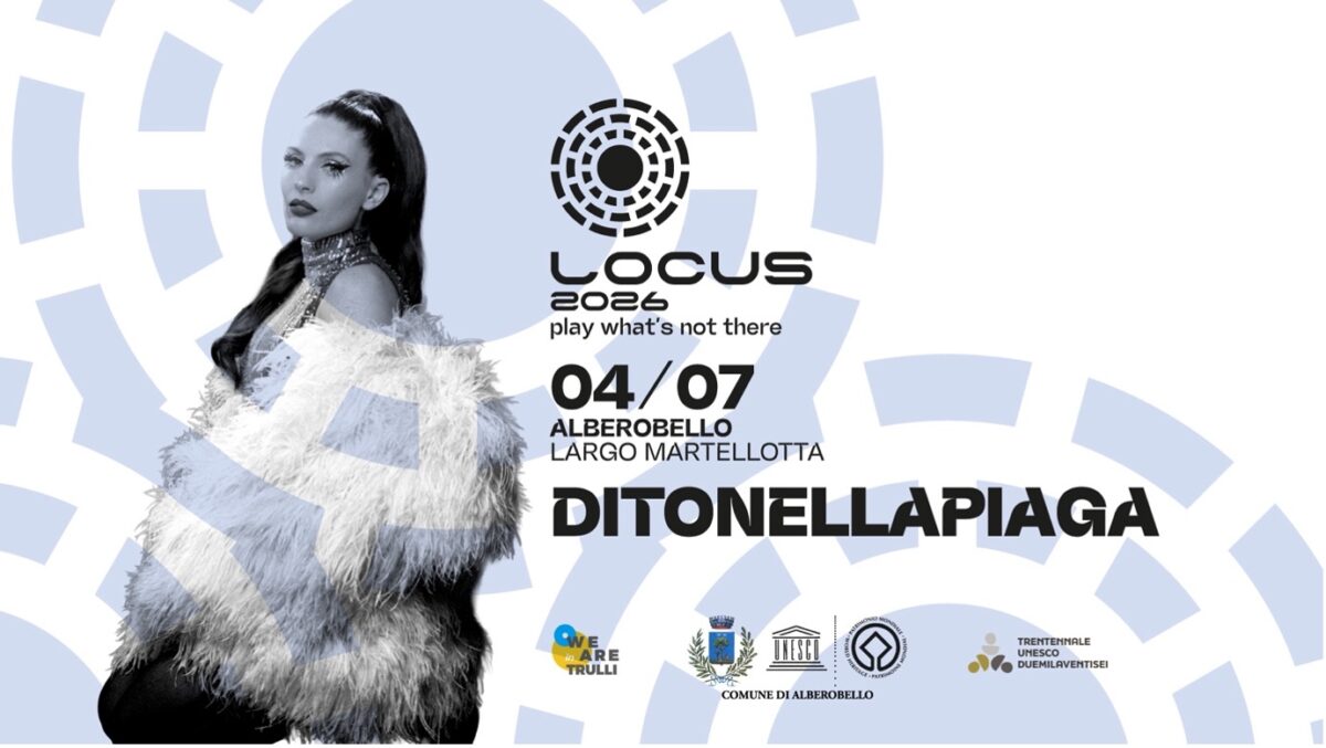 Sabato 4 luglio 2026 il Locus festival fa ritorno nel cuore fiabesco di Alberobello, tra quei trulli che proprio quest’anno festeggiano il trentennale dell’ingresso nel Patrimonio dell’Umanità dell’UNESCO. Protagonista di questo appuntamento di piazza a ingresso gratuito è DITONELLAPIAGA, reduce dal grande successo sanremese con “Che fastidio” e del suo ultimo album “Miss Italia” La cantautrice romana arriva con quell’energia esplosiva che ha conquistato l’Ariston e oltre, portando un repertorio pop alternativo intriso di ironia e ritmo.