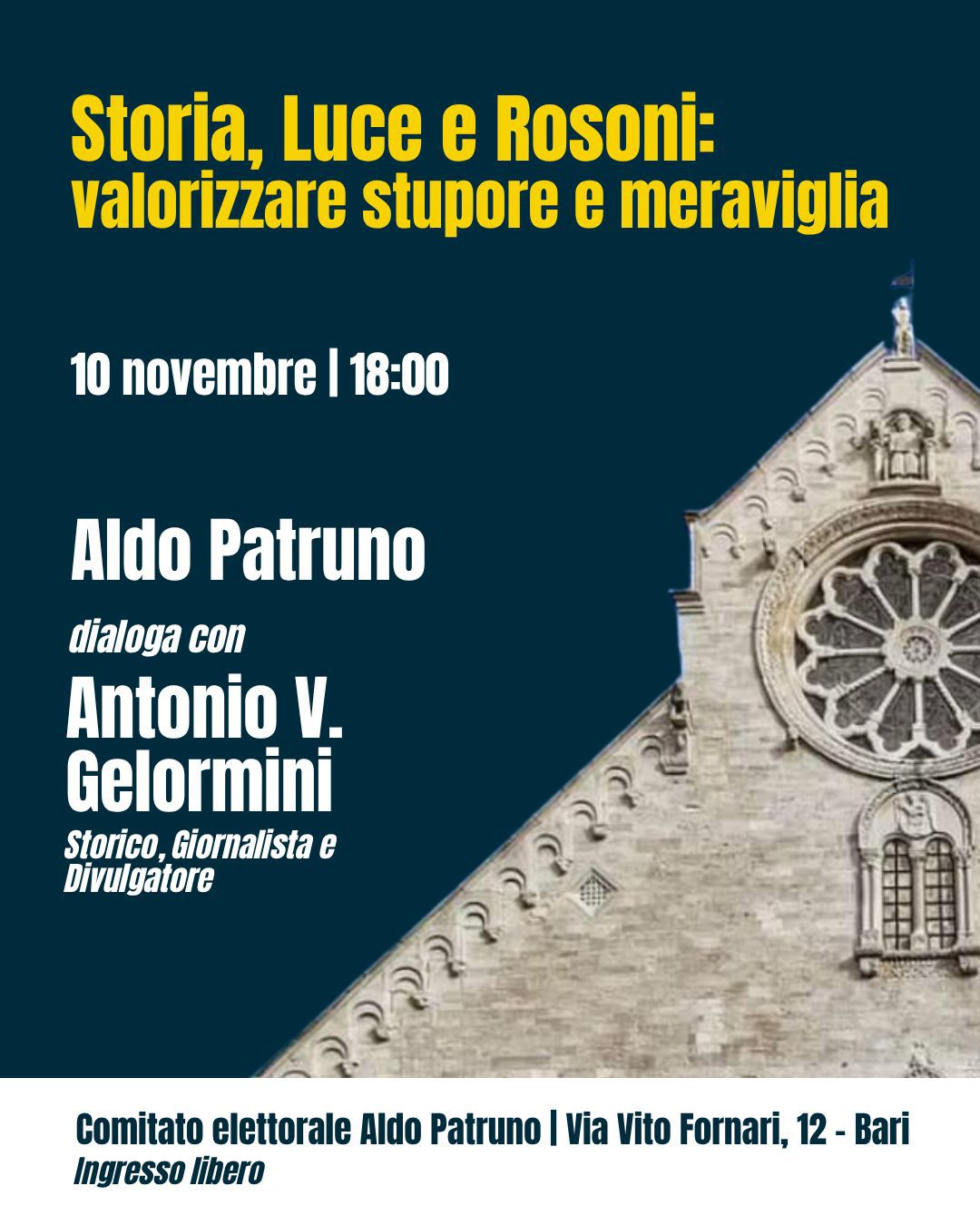 Mentre ancora a Bari, nella sede del Comitato elettorale in via Fornari, con Antonio V. Gelormini - Storico, Giornalista e Divulgatore col dialogo su “Storia, Luce e Rosoni: valorizzare stupore e meraviglia” si immagina, analizza e verifica la prospettiva formativa d’un modo nuovo di dare valore, forza attrattiva e capacità di favorire 'permanenze lunghe' alle eccellenze e ai patrimoni diffusi di Puglia.