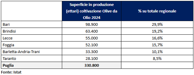 E in tale realtà, con 720 frantoi attivi e una superficie in produzione di olive da olio di 330.800 ettari, pari al 31,5% del totale nazionale, la Puglia si conferma la prima regione olivicola d’Italia. A livello provinciale, Bari è al primo posto con una superficie di 98.900 ettari, seguita da Brindisi (63.400 ettari), Lecce (55.000 ettari), Foggia (52.100 ettari), Barletta-Andria-Trani (33.300 ettari) e Taranto (28.100 ettari).