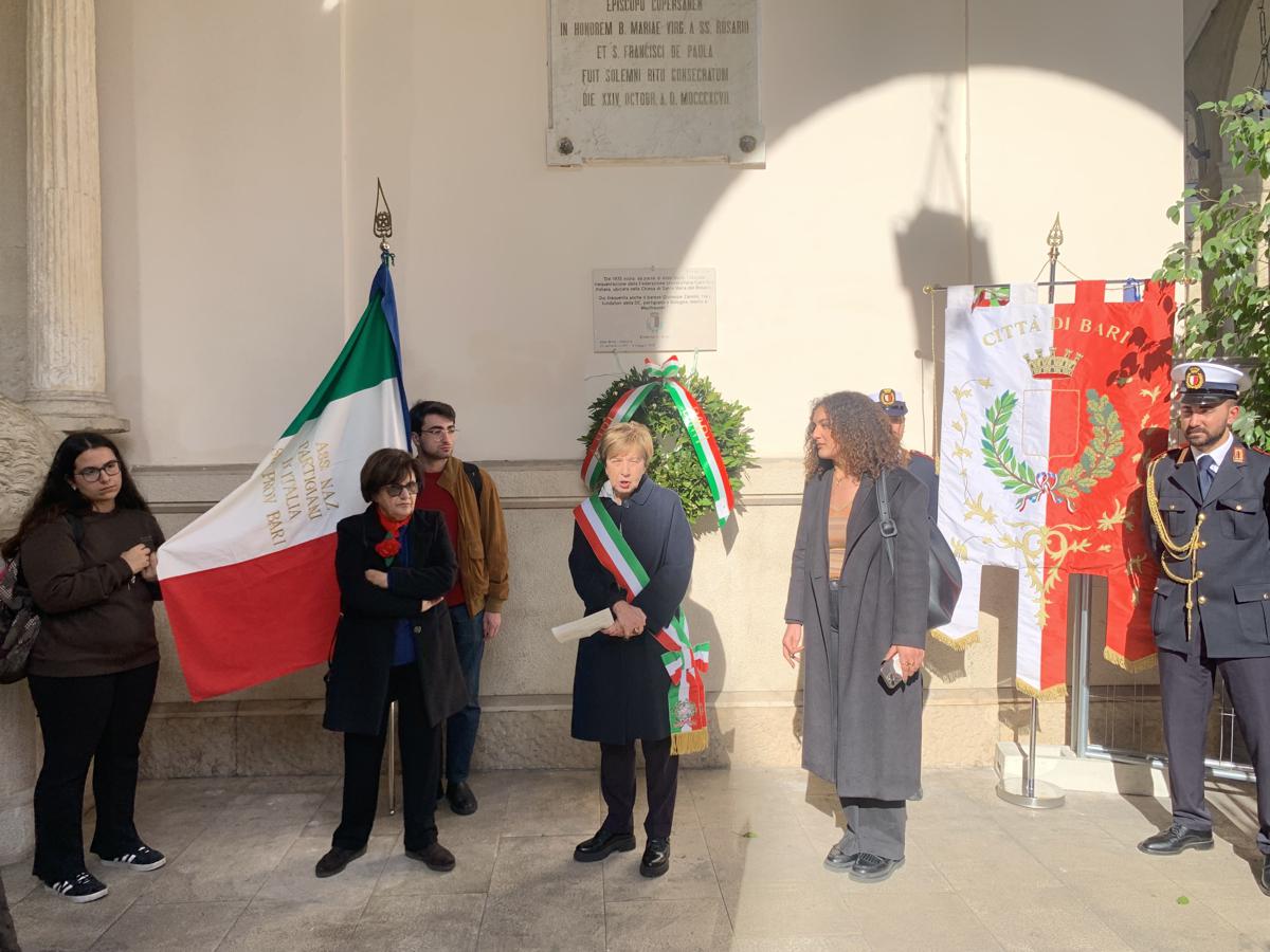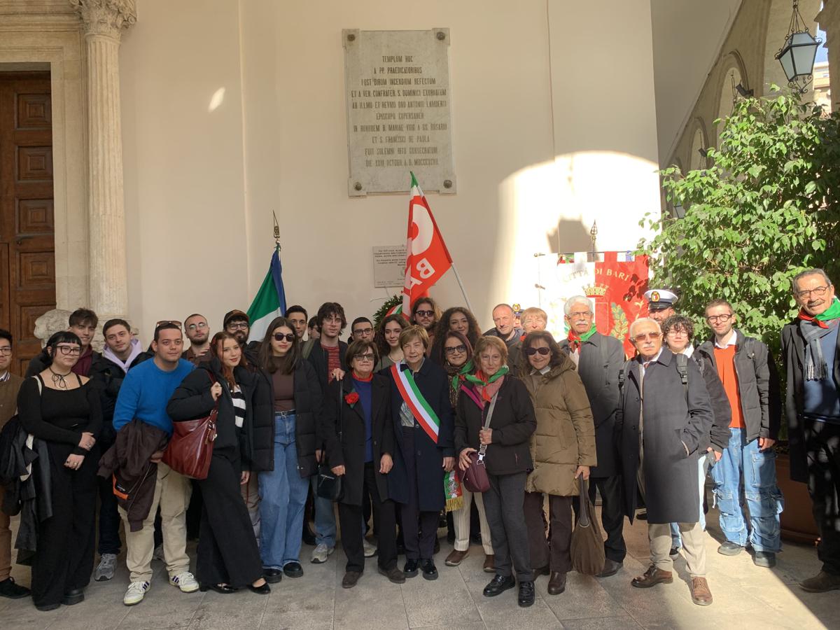 Il sindaco di Bari Vito Leccese e il prefetto di Bari Francesco Russo hanno deposto una corona di fiori presso la targa commemorativa affissa nella sala consiliare di Palazzo di Città. Hanno partecipato all’iniziativa, inoltre, il presidente del comitato provinciale dell’Anpi Pasquale Martino, l’onorevole Gianmauro Dell’Olio, Giulia Lenoci del Coordinamento provinciale antifascista e altri rappresentanti delle realtà promotrici della commemorazione.