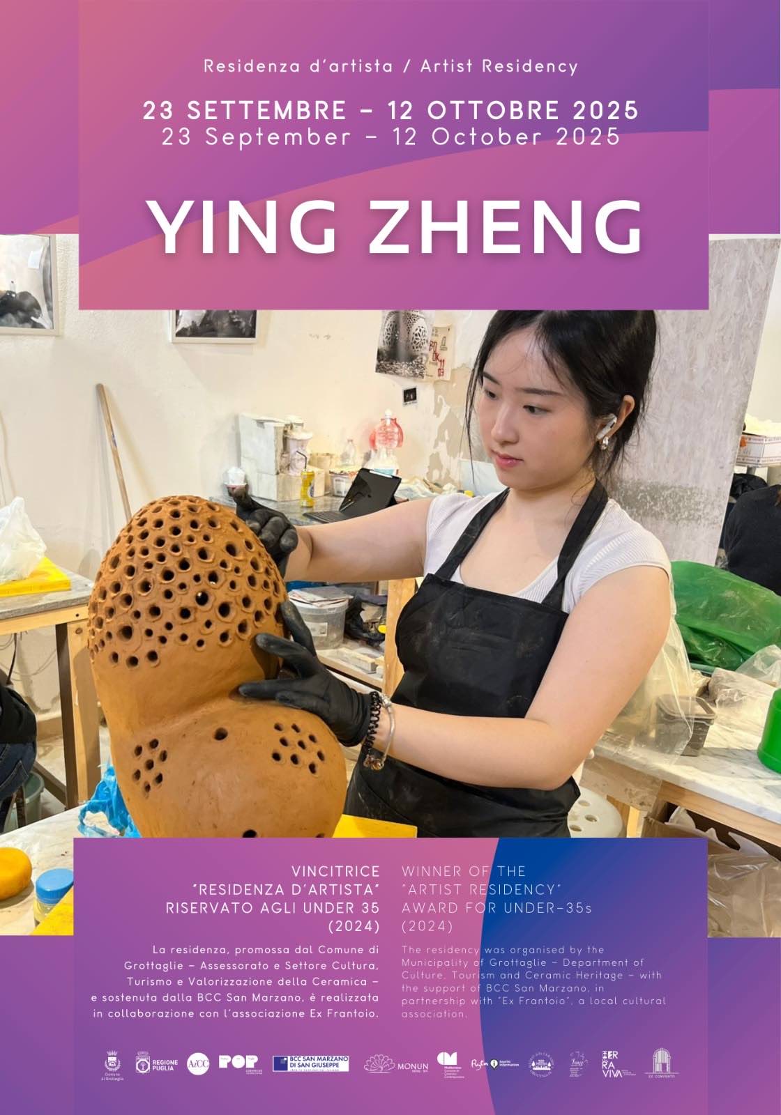 Nella stessa occasione, saranno presentati i risultati della residenza d’artista della ceramista cinese Ying Zheng, 26enne residente a Londra, vincitrice del premio under 35 della XXXI edizione del Concorso. Dal 23 settembre al 12 ottobre, l’artista è stata a Grottaglie, ha vissuto nel Quartiere delle Ceramiche e ha creato nuove opere in ceramica utilizzando gli spazi e le strumentazioni del laboratorio Craft Lab del Convento dei Cappuccini.