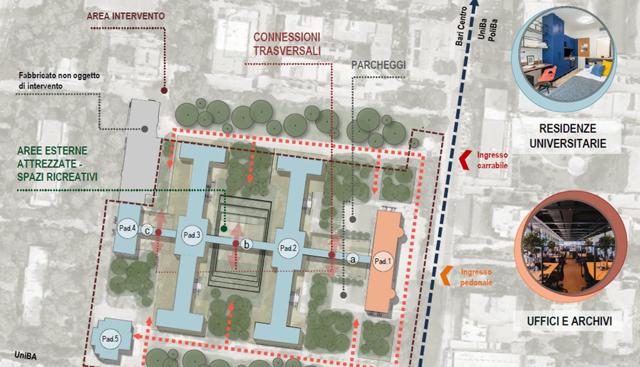 Le nuove funzioni previste, in particolare, riguarderanno in particolare la realizzazione di residenze universitarie per circa 416 studenti, alloggi per visiting professor e dottorandi di ricerca nonché spazi ad uso ufficio per Adisu Puglia, con annessi relativi spazi ad uso archivio.