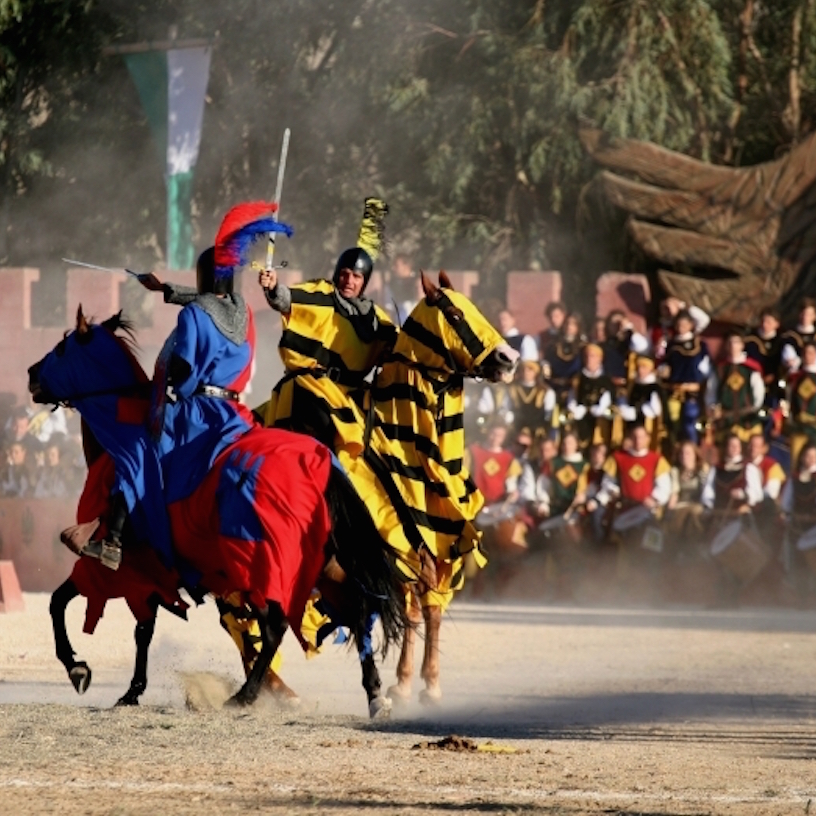 Gli spettatori saranno catapultati in un autentico viaggio nel Medioevo, con una ricca serie di Spettacoli a Corte: danzatrici orientali, giullari, domatori di serpenti, trampolieri, falconieri e ben quattro gruppi di sbandieratori, accompagnati da musici e figuranti in costume, daranno vita a uno show itinerante e immersivo.