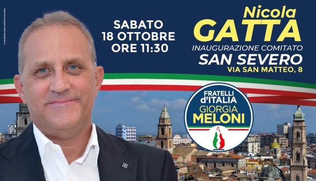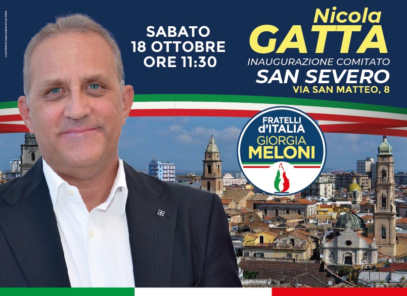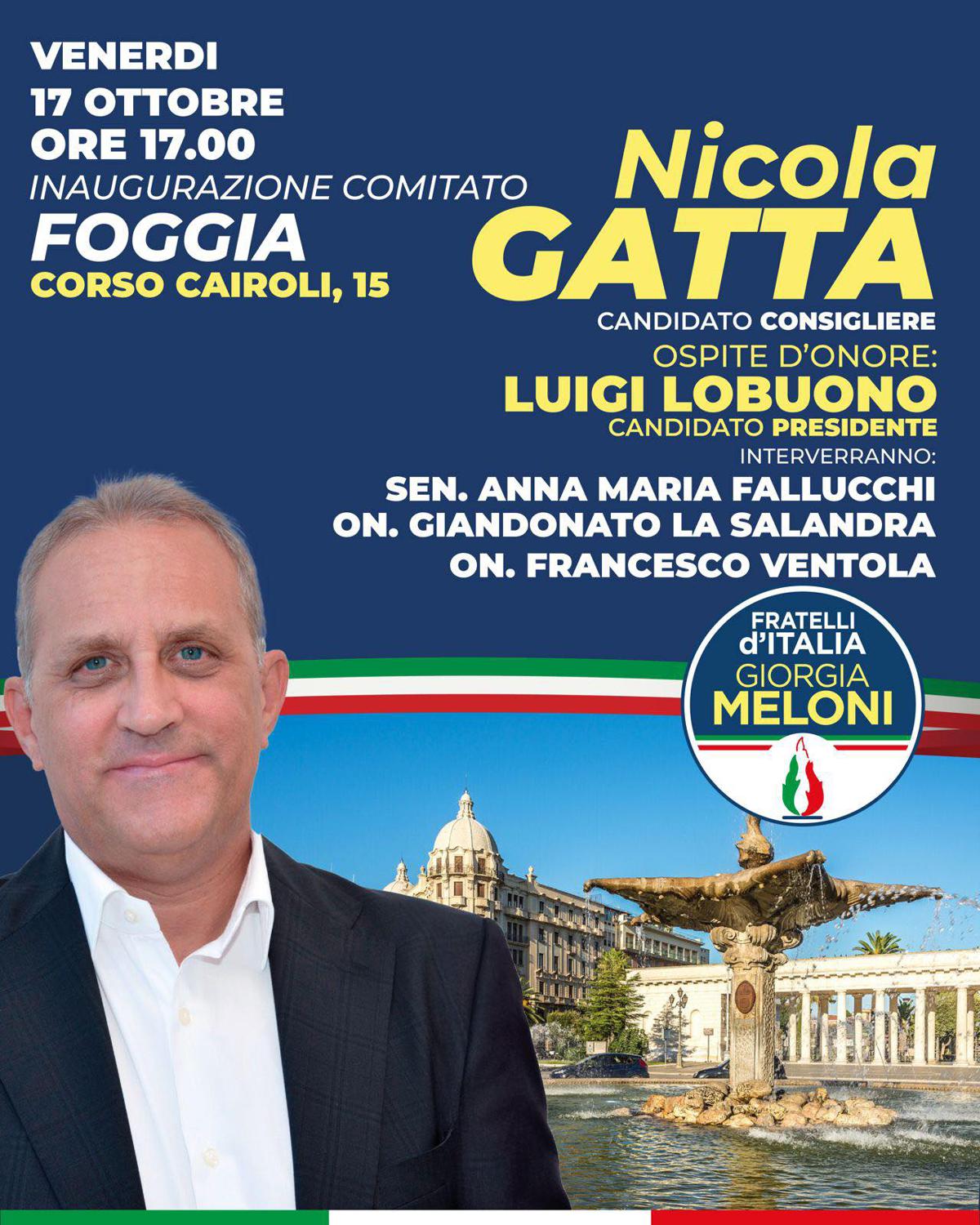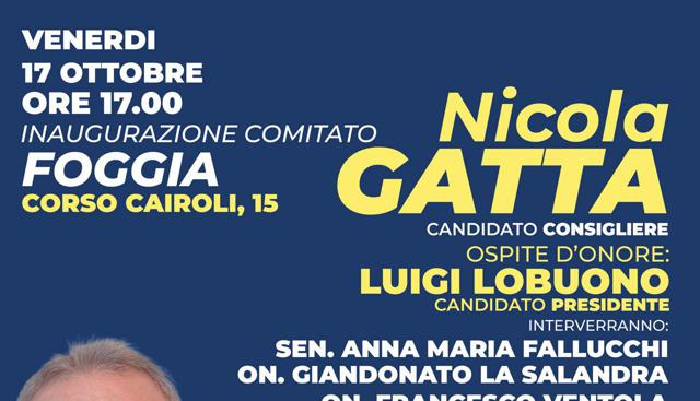 Venerdi 17 ottobre (alle 17:00, in barba ad ogni scaramanzia) in Corso Cairoli 15 a Foggia, l'inaugurazione del Comitato Elettorale di Nicola Gatta (Fratelli d'Italia): canditato al Consiglio Regionale Puglia.