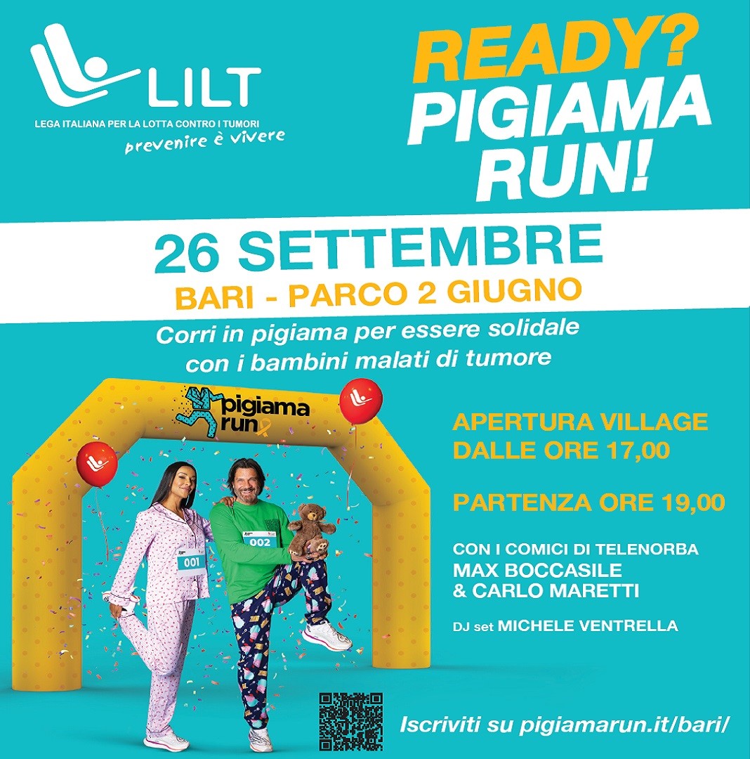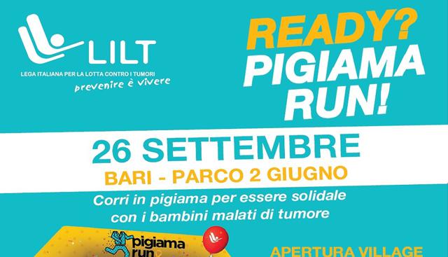 La Pigiama Run è un evento non competitivo, aperto a tutti, che vede i partecipanti camminare o correre “in pigiama”, in segno di solidarietà con tutti i piccoli "guerrieri" che ogni giorno, nel proprio letto di ospedale, lottano contro il cancro. Giunta quest’anno alla 7a edizione, la Run promossa della Lilt si svolge sempre a settembre, mese dedicato in tutto il mondo alla Gold Ribbon, ovvero alla sensibilizzazione sui tumori pediatrici, e si disputerà in contemporanea in oltre 30 città italiane (in Puglia anche a Taranto).