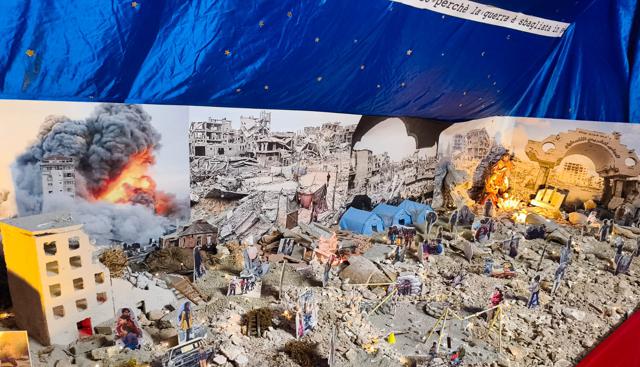 "Per questo abbiamo scelto di allestire la Natività tra le macerie, dove al posto delle classiche statuine ci sono scene di vita quotidiana nelle località colpite dalle guerre. Attraverso questo presepe vogliamo invitare ad una riflessione profonda: 'Che cosa significa per noi la Natività? È solo una tradizione o è un appello a costruire la pace anche in mezzo al caos della guerra?'. L'invito - ha concluso Rinaldi - è quello di trovare la speranza e la fede anche nelle situazioni più difficili ed a non dimenticare le vittime innocenti. La pace di Gesù non è fatta di armi, ma di amore e non teme la guerra".