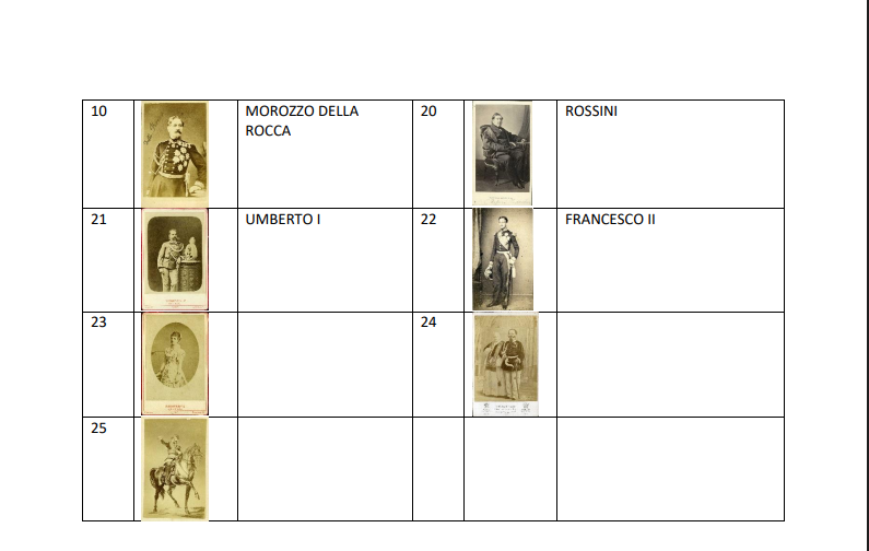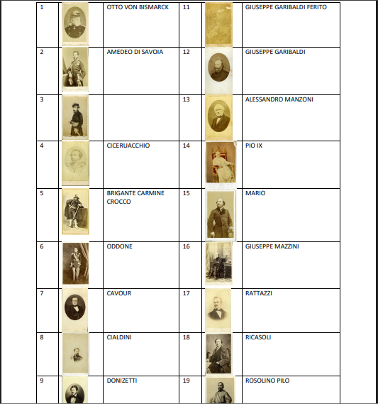 Sono 24 i ritratti originali del Risorgimento - da Cavour a Garibaldi, da Mazzini alle donne patriote - in formato dell’epoca ovvero Carte de Visite e Gabinetto, provenienti dalla Collezione Pansini di Canosa di Puglia (Ba), che accompagneranno il visitatore, facendolo incontrare con i protagonisti dell’Unità d’Italia in modo inedito.