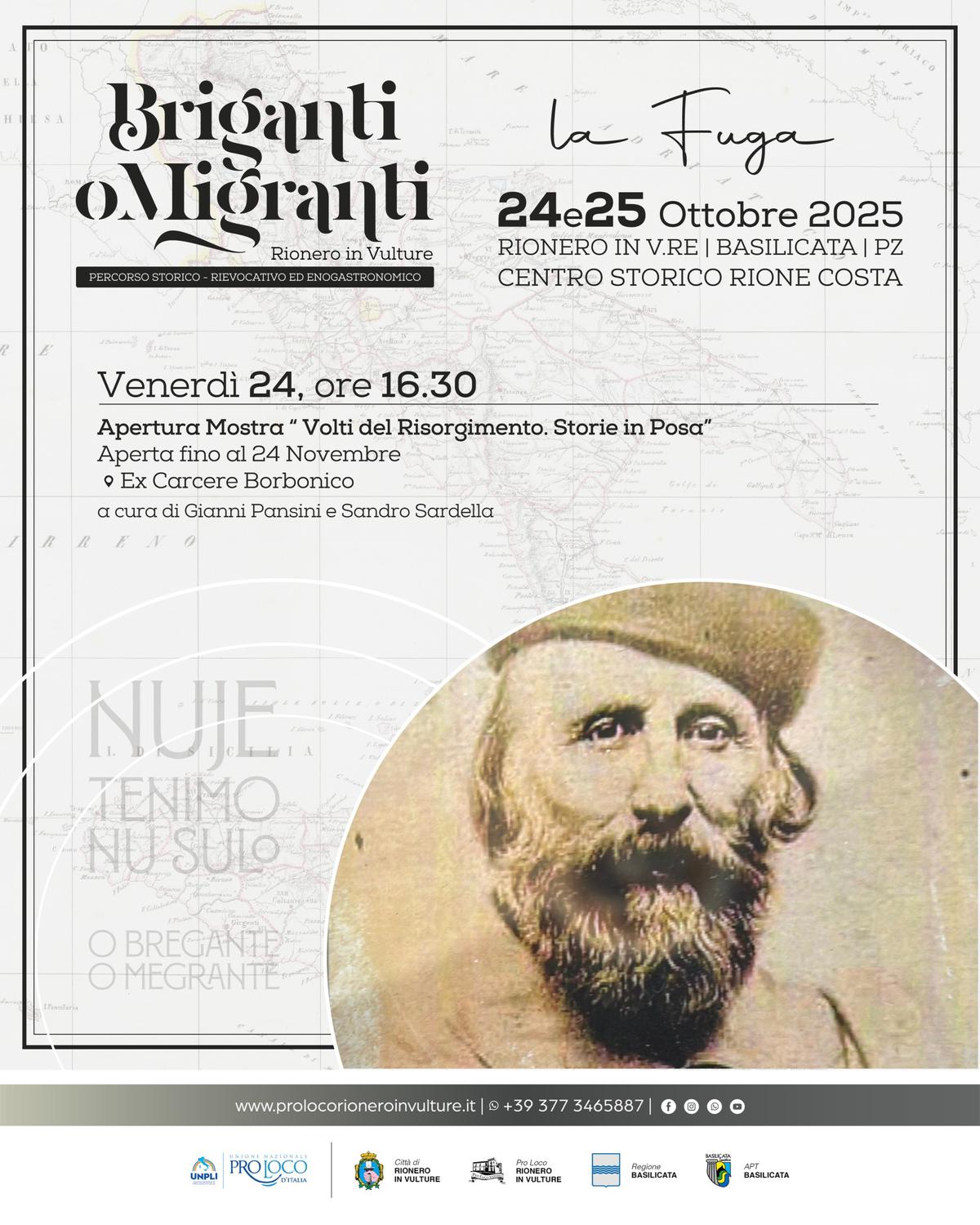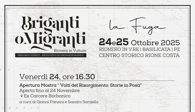 Promosso e curato dalla Pro Loco Rionero in Vulture, con il patrocinio della Città di Rionero in Vulture, dell’Unpli Basilicata, della Regione Basilicata e dell’Apt Basilicata, il progetto si presenta quest’anno con l’evocativo sottotitolo “È la fuga”, promettendo un percorso immersivo che mette in dialogo l’epopea brigantesca con il fenomeno migratorio lucano.