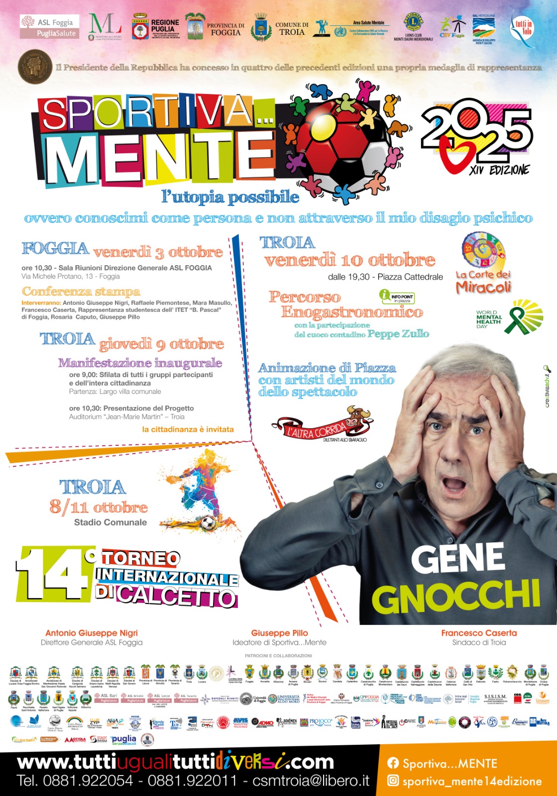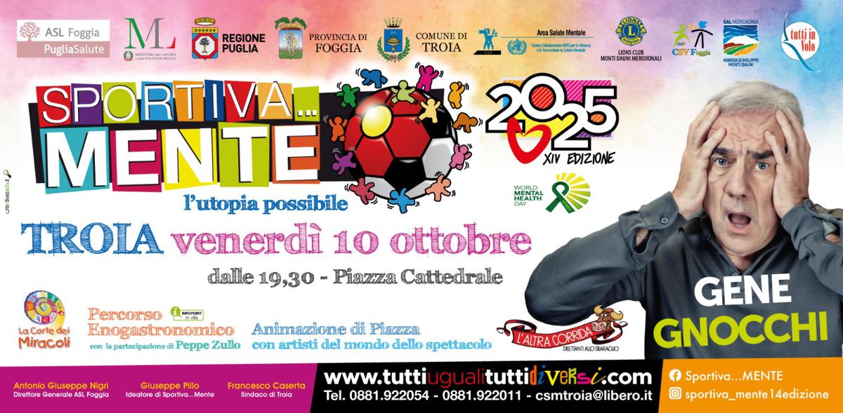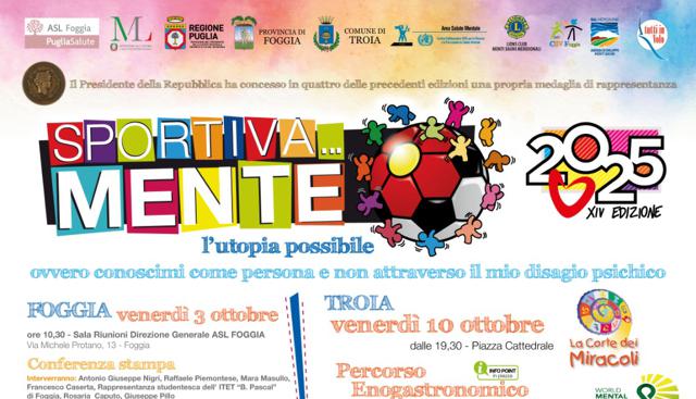 La XIV EDIZIONE di SPORTIVAMENTE - L’utopia possibile - L’inclusione sociale attraverso gli scambi, il progetto di inclusione sociale ideato dal Dr. Giuseppe Pillo - Psichiatra-Psicoterapeuta, Centro Salute Mentale di Troia (Fg) torna nella cittadina daunia dall’8 all’11 ottobre 2025 col doppio appuntamento autunale: