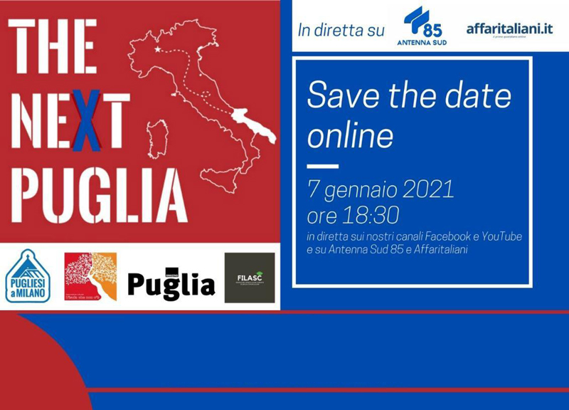Il tema delle opportunità si designa fil rouge dell’intero incontro per cogliere le criticità come elementi di opportunità per creare relazione, far luce e portare a termine tematiche note ormai da tempo. L’evento on line sarà introdotto da Nicola Tattoli, presidente dell’Associazione Pugliesi a Milano, sarà condotto da Fabio Mollica direttore della rivista Amazing Puglia e sarà condotto e moderato da Franco Giuliano - fondatore e attuale Presidente della Associazione L’isola che non c’è.