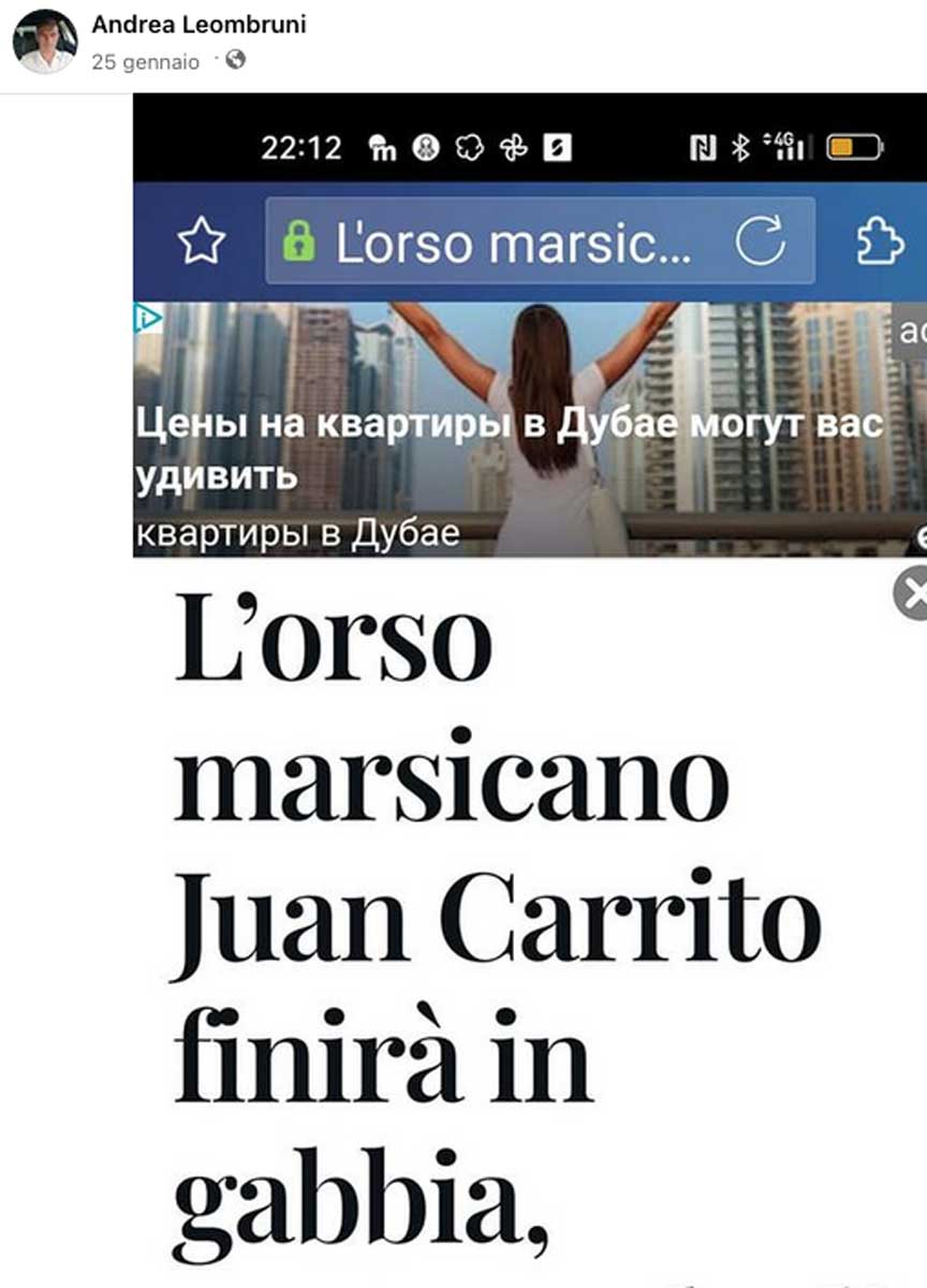 L'uomo non è ancora indagato e le sue responsabilità dovranno eventualmente essere accertate. La sua faccia è alla mercé della Rete, che si scaglia senza pietà. Ma la sua bacheca di Facebook è diventata un tiro al bersaglio. Centinaia di insulti e minacce, in particolare, a commento di un post datato 25 gennaio, che non può passare inosservato. Nell'immagine si legge “L'orso marsicano Juan Carrito finirà in gabbia”. Juan Carrito, altro orso amatissimo dagli abruzzesi, era il figlio di Amarena ed è morto qualche mese fa, ucciso da una macchina, a Rionero Sannitico.