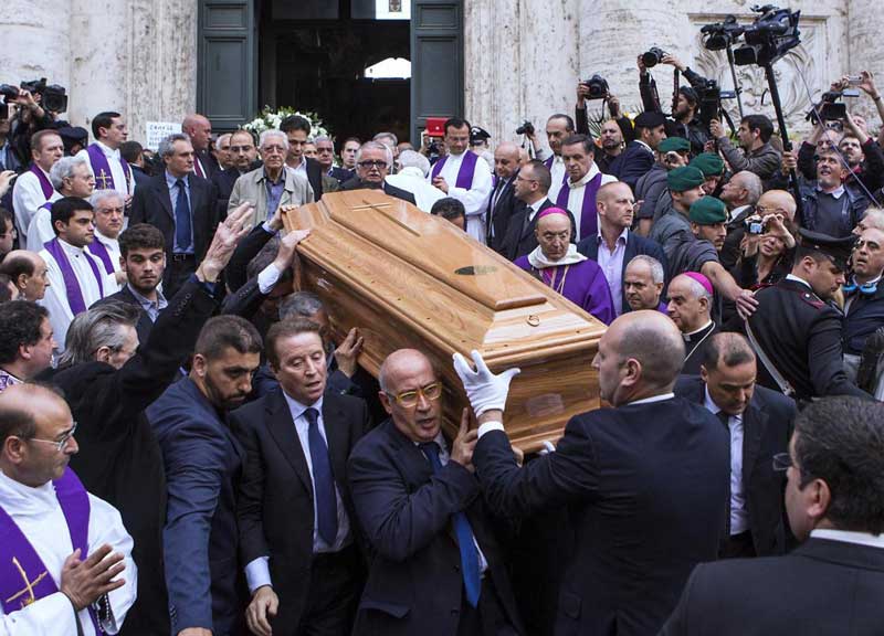 Tra le sacre pietre sulle quali è passato ogni mattina prima di attendere ai suoi uffici politici, e dove ha ricevuto l'ultimo sacramento, si sono ritrovati in un meriggio romano con un caldo afoso che ha fatto sembrare alcuni completi blu d'ordinanza ancora più stretti, avvinghiati ai corpi imbolsiti dagli anni, quelli che probabilmente lo hanno amato davvero. Come i due uomini dal volto scuro che confabulano con spiccato accento ciociaro, esibendo una copia del quotidiano locale nella tasca della giacca; quello che veniva stampato dal fedele Giuseppe Ciarrapico e che portava centinaia di migliaia di preferenze a ogni elezione. Ci sono i militari dell'Arma che hanno vigilato sulla sua sicurezza per anni, svetta il Maresciallo Buttarelli folgorato per più di trent'anni dagli obiettivi dei fotografi. Fino all'ultimo, quando sosteneva il Senatore a vita mentre entrava nel suo studio a Palazzo Giustiniani.