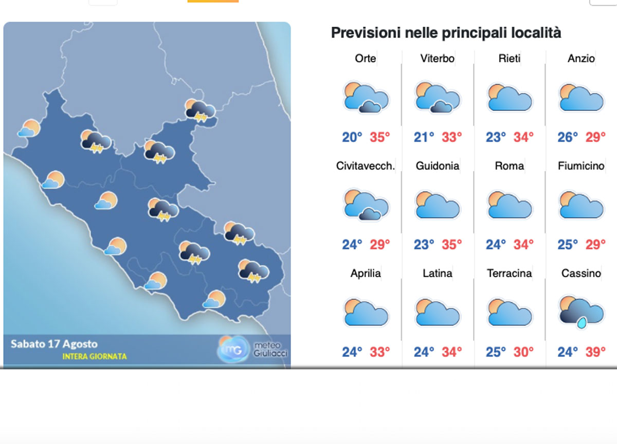 Più precisamente nelle prime ore cielo poco nuvoloso, al mattino nubi sparse, le temperature minime si attesteranno intorno a 23°C; nel pomeriggio nubi sparse, così come in serata, la temperatura nelle ore più calde sarà di circa 36°. Intensità dei venti debole da NE al mattino, sempre debole ma da NW nella seconda parte del giorno; le raffiche raggiungeranno circa 12 km/h. Lo zero termico sarà circa 3900 metri in flessione nell'arco della giornata.