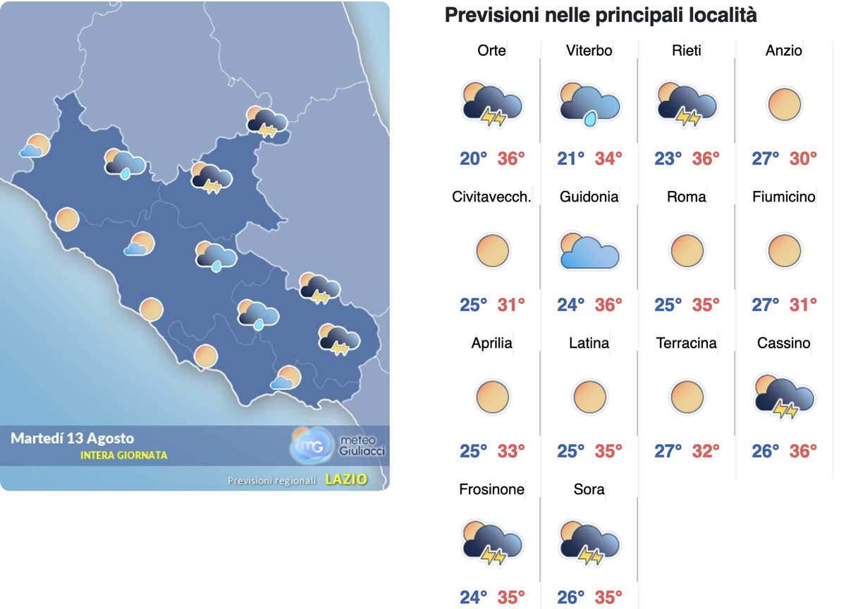 Meteo Roma 13 agosto: + 34 gradi poi + 35 sino al giorno di Ferragosto in cui sono previsti 37 gradi. Ma per l'anticiclone africano sembra iniziato il conto alla rovescia che dovrebbe culminare nel prossimo week end con un significativo abbassamento delle temperature. Sui rilievi intorno a Roma possibili temporali pomeridiani.