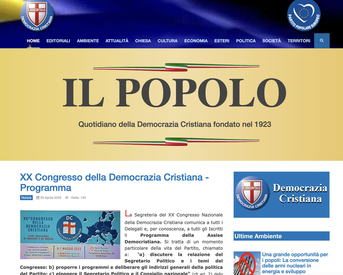 La Democrazia Cristiana c'è e si moltiplica più dei pani e dei pesci. Archiviato il congresso numero XIX del marzo scorso, sabato 6 maggio arriva un nuovo congresso, il XX congresso precisamente, con tanto di liturgia, lavori dell'Ufficio di presidenza, e Santa Messa a cura di monsignor Tommaso Stenico, già direttore editoriale de Il Popolo.