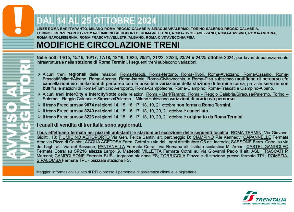 TORINO/FIRENZE/NAPOLI – ROMA-FIUMICINO AEROPORTO, ROMA-NETTUNO, ROMA-TIVOLI/AVEZZANO, ROMA-CASSINO, ROMA-ANCONA,