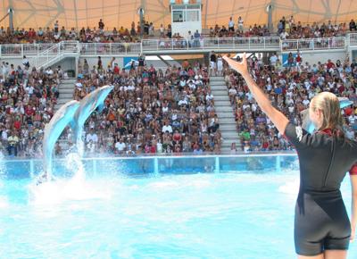 Delfini saltatori in uno spettacolo allo Zoomarine.