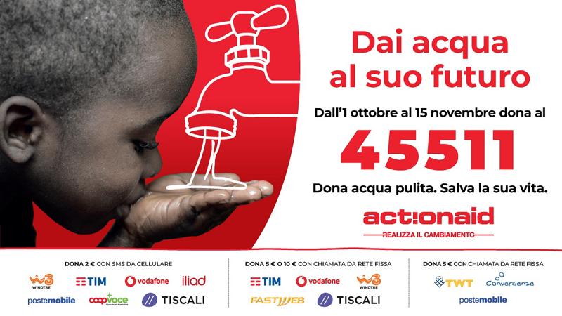 Con la campagna solidale “Dai acqua al futuro dei bambini del Kenya”, grazie a sms e chiamate da retefissa al numero solidale 45511, tutti potranno dare un contributo per sostenere il progetto di ActionAid e garantire acqua, salute e possibilità di crescita ai bambini e alle famiglie delle zone più vulnerabili del Kenya, dove ActionAid è attivo da quasi 50 anni e riconosciuto come una delle più importanti organizzazioni di contrasto alla povertà del Paese.