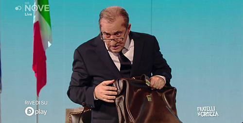 Una grande rivelazione questa sera nel corso di Fratelli Di Crozza, il programma di Maurizio Crozza in onda tutti i venerdì in prima serata sul Nove: il Ministro Tria a margine della conferenza stampa del Governo, estrae dalla sua borsa ‘la manina’ fantasma rivelando così di essere stato lui ad apportare i cambiamenti nel contratto di Governo denunciati dal Vicepremier Di Maio.