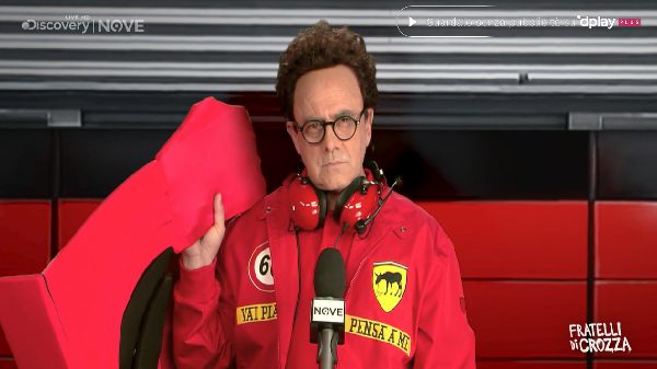 Maurizio Crozza nei panni di Binotto, Team Manager della Ferrari, ancora impegnato a schivare gli oggetti che Leclerc gli lancia dopo l’ultima, disastrosa, gara in Russia. Ma le cose sembrano migliorare in Ferrari e tutto è pronto per la sfida in Germania, a condizione che il tempo sia bello perché “Se piove Leclerc vuole andare in metro perché dice che arriva prima”.