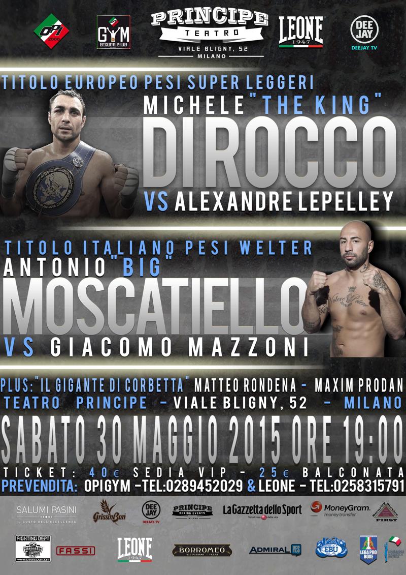 Moscatiello-Mazzoni basta a soddisfare gli appassionati, ma la Principe Boxing Events di Alessandro Cherchi e la OPI 2000 di Salvatore Cherchi hanno messo in piedi una riunione molto ricca con il match tra il campione d’Europa dei pesi superleggeri Michele Di Rocco (39-1-1) e il francese Alexandre Lepelley (18-3-1) e i combattimenti dell’imbattuto peso massimo leggero Matteo Rondena (3-0) e del peso superwelter Maxim Prodan (ventunenne che ha svolto un’intensa attività giovanile in Ucraina e che si allena alla Opi Gym sotto la direzione di Franco Cherchi).
