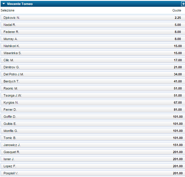 (Fonte Snai)Nel tennis la stagione è lunga e la corsa al numero uno del mondo a fine anno porta troppo in là. Limitiamoci all’Australian Open dove William Hill vede Novak Djokovic (attale leader dell’Atp) nettamente avanti a tutti. Il ruolo di principale oppositore è assegnato a Rafa Nadal, che è reduce da mesi di inattività per problemi fisici e dovrà dimostrare di essere subito pronto e senza ruggine nei suoi solitamente oliatissimi meccanismi. Il vincitore dello scorso anno, Stan “The Men” Wawinka, viene pagato sino a 15 volte la posta iniziale. Meglio di lui il suo connazionale ed ‘eterno’ Roger Federer: il successo a 33 anni del fenomeno di Basilea sarebbe una bella favola per il tennis e viene quotata a 8, esattamente come il terzo Slam di Andy Murray (Wimbledon e Us Open già suoi, oltre al titolo olimpico sull’erba londinese)…