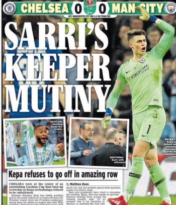 Kepa si è pubblicamente scusato con Sarri spiegando che non ha mai voluto disobbedirgli è che è stato tutto un malinteso. I giornali e i tabloid inglesi sono molto duri. "L’ammutinamento di Kepa è emblematico che la nave di Sarri al Chelsea sta affondando" scrive il The Guardian. Il Times titola "Ammutinamento finale" e scrive: “Kepa mette in imbarazzo il club e Sarri”. "Anarchia al Chelsea" è il titolo del The Guardian. Per il Mirror il gesto di Kepa è "Rivoltante" e "dovrebbe essere licenziato dal Chelsea dopo aver snobbato Maurizio Sarri”.