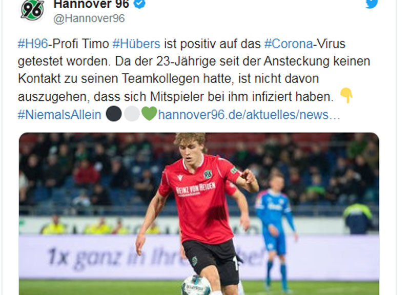Da allora Hübers, 23 anni, non ha avuto contatti con i suoi compagni di squadra e si ritiene che nessun altro giocatore sia stato infettato. A tutto il personale, così come il team tecnico e il personale del club, sarà fatto il tampone per precauzione, ha dichiarato il club in una nota. L'Hannover giocherà in casa contro la Dinamo di Dresda domenica in una partita a porte chiuse.