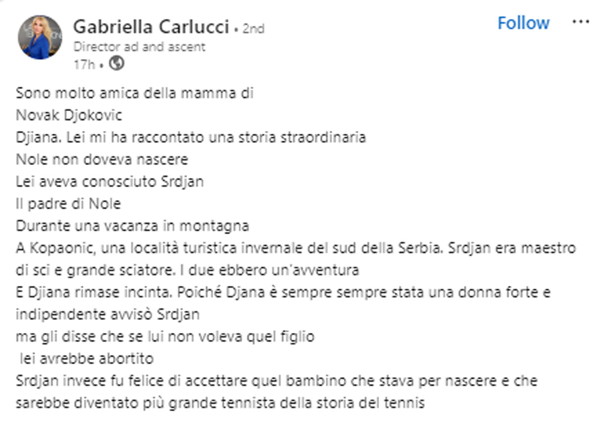 “Nole non doveva nascere” dice Gabriella Carlucci, conduttrice televisiva e deputata per tre legislature. Sta parlando di Novak Djokovic, uno dei tennisti più forti del mondo e reduce della vittoria alle Olimpiadi di Parigi 2024. Si dà il caso che Carlucci sia molto amica della madre di Nole, Djiana Djokovic, e che nel suo ultimo post su Linkedin abbiamo pubblicato delle foto con lei raccontanto una storia inedita e molto privata della famiglia del tennista. “Djiana mi ha raccontato una storia straordinaria: Nole non doveva nascere”, esordisce Carlucci.