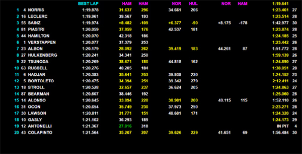 Terzo posto per la Williams di Carlos Sainz, che incassa oltre mezzo secondo dal sette volte campione del mondo, mentre Max Verstappen (Red Bull) è a +0’575. Ottimo quinto tempo per la Mercedes di Andrea Kimi Antonelli, che precede la McLaren di Lando Norris. Al posto del leader del Mondiale Oscar Piastri, spazio al giovane Alex Dunne, che chiude con il sedicesimo tempo. Alle 17 andrà in scena la seconda sessione di prove libere sul tracciato di Monza.