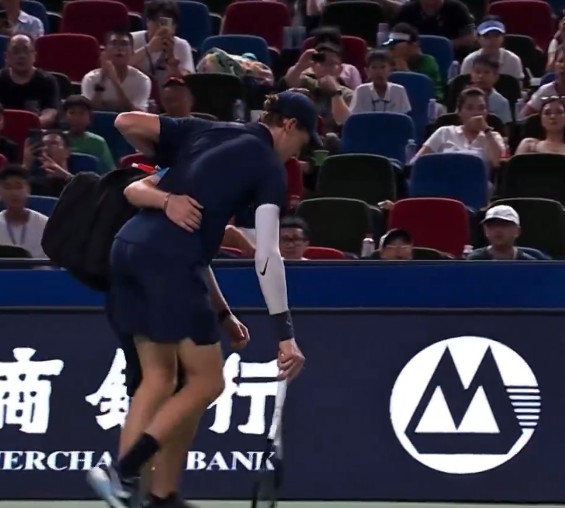 The video of the physio helping Jannik Sinner walk to his chair before retiring from the match in Shanghai.