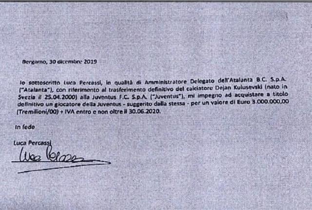 Non si parla né di quale giocatore, né con quale modalità, ma si fa solo riferimento al prezzo di un acquisto “a titolo definitivo”. Un ulteriore tassello che complica la posizione della Juve. Ecco, dunque, come pubblicato anche dal direttore del Domani Stefano Feltri, la lettera del presidente dell’Atalanta Antonio Percassi che faceva riferimento al trasferimento di Kulusevski in bianconero.