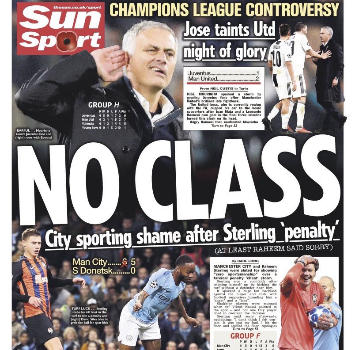 Il Manchester United batte la Juventus a Torino 2-1 in rimonta, con le reti di Mata e l'autorete di Alex Sandro, ribaltando un match che sembrava segnato dopo la perla di Ronaldo, ma è soprattutto la reazione finale di José Mourinho, che si è portato la mano all'orecchio, nei confronti dei tifosi della Juventus, a far discutere i media britannici e non solo. Duro il commento del Sun: "No class", con la foto del gesto di José Mourinho, paragonandolo al comportamento del City di Guardiola, e di Sterling in particolare, in occasione del rigore regalato contro lo Shakhtar Donetsk.
