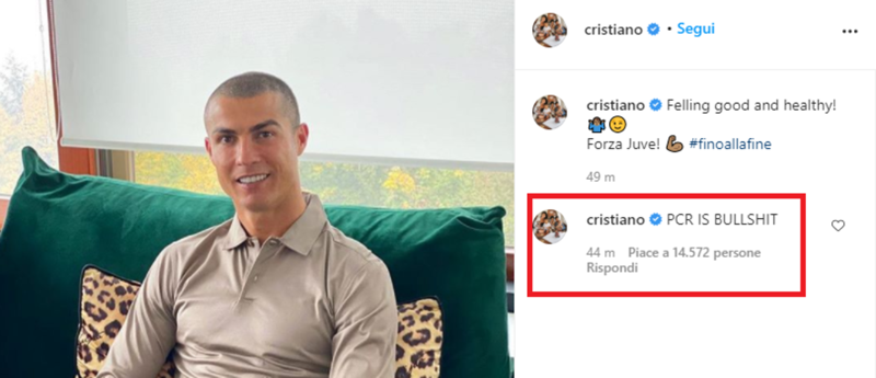 “PCR (il tampone con metodica molecolare, ndr) is BULLSHIT (ca… ndr)”, aggiunge CR7 nei commenti. Poi il fuoriclasse portoghese cancella la frase. L’attaccante della Juventus resta dunque in isolamento domestico nella sua villa in collina, dalla quale non esce ormai dal 15 ottobre, il giorno in cui ha fatto ritorno da Lisbona. Era risultato risultato positivo al Covid-19 lo scorso 13 ottobre, prima di una partita di Nations League che avrebbe dovuto giocare con la maglia del Portogallo.