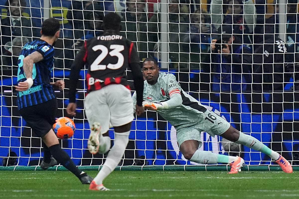 Maignan para il rigore a Calhanoglu nel derby (foto Lapresse)