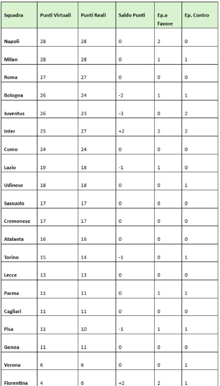 Milan e Napoli in testa? Juventus e Bologna penalizzate, l'Inter perde punti e posizioni... - Classifica Serie A Senza Errori Arbitrali