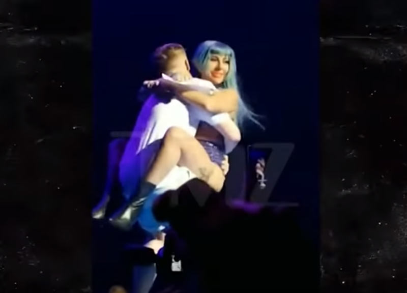 Lady Gaga cade giù dal palco insieme a un fan