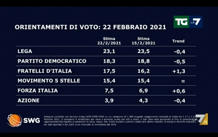 Lega e Pd scendono: Matteo Salvini e Nicola Zingaretti vedono i loro partiti calare nei sondaggi by Swg per il Tg La7 di Enrico Mentana. Vola Fratelli d'Italia, mentre è stabile M5S. Cresce Forza Italia, mentre è in discesa Azione di Calenda. Vediamo i trend dei vari partiti politici secondo quanto risulta a questo sondaggio.