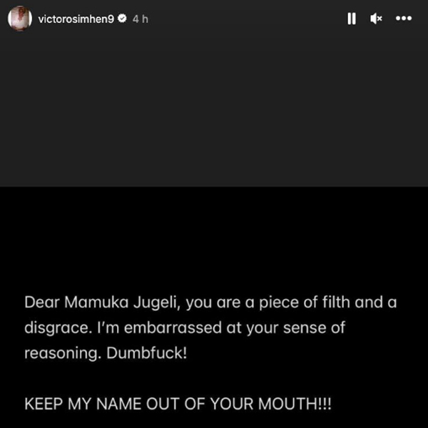“Caro Mamuka Jugeli, sei un rifiuto umano e una vergogna. Sono imbarazzato dal tuo modo di ragionare, Idiota! Tieni il mio nome fuori dalla tua bocca”. Viktor Osimhen ha pubblicato una Instagram story sul suo profilo personale attaccando duramente l’agente di Khvicha Kvaratskhelia.