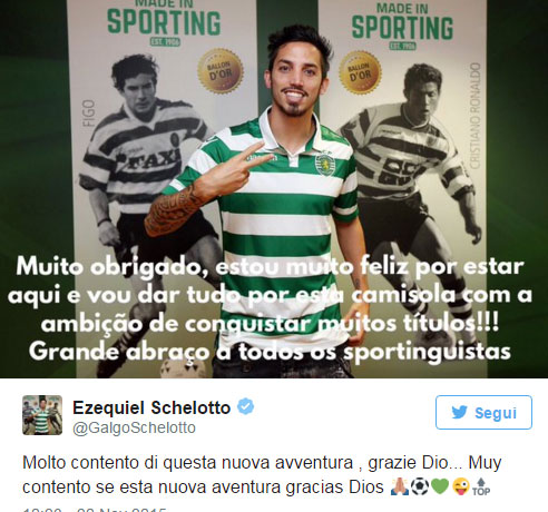 Schelotto aveva rescisso il contratto con l'Inter alla fine dello scorso mercato estivo. In Italia oltre ai nerazzurri ha giocato pure con Cesena, Catania, Atalanta, Sassuolo, Parma e Chievo. Ultimamente si era parlato anche dell'Hellas Verona, ma alla fine ha prevalso il fascino di un club come lo Sporting Lisbona.