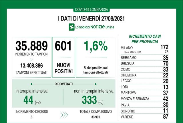 Coronavirus in Lombardia: 601 nuovi positivi e tre decessiVenerdì, 27 agosto 2021Coronavirus in Lombardia, continuano a diminuire i ricoverati nei reparti (-6). Con 35.889 tamponi effettuati, sono 601 i nuovi positivi (1,6%). Tre decessi