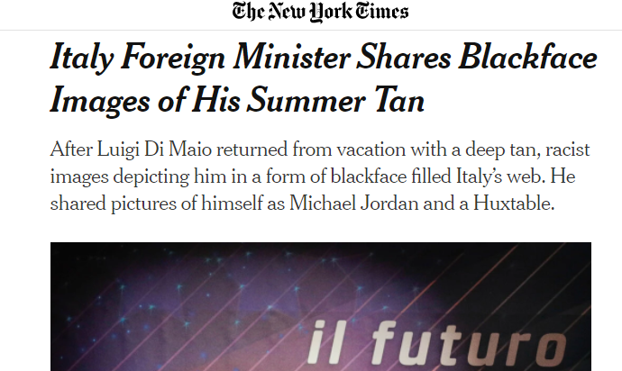 Di Maio abbronzato sotto attacco negli Usa. Il Nyt: “Scherza sul Blackface”Venerdì, 28 agosto 2020IL NEW YORK TIMES SUI MEME DI DI MAIO ABBRONZATO, 'SCHERZA SUL BLACKFACE'